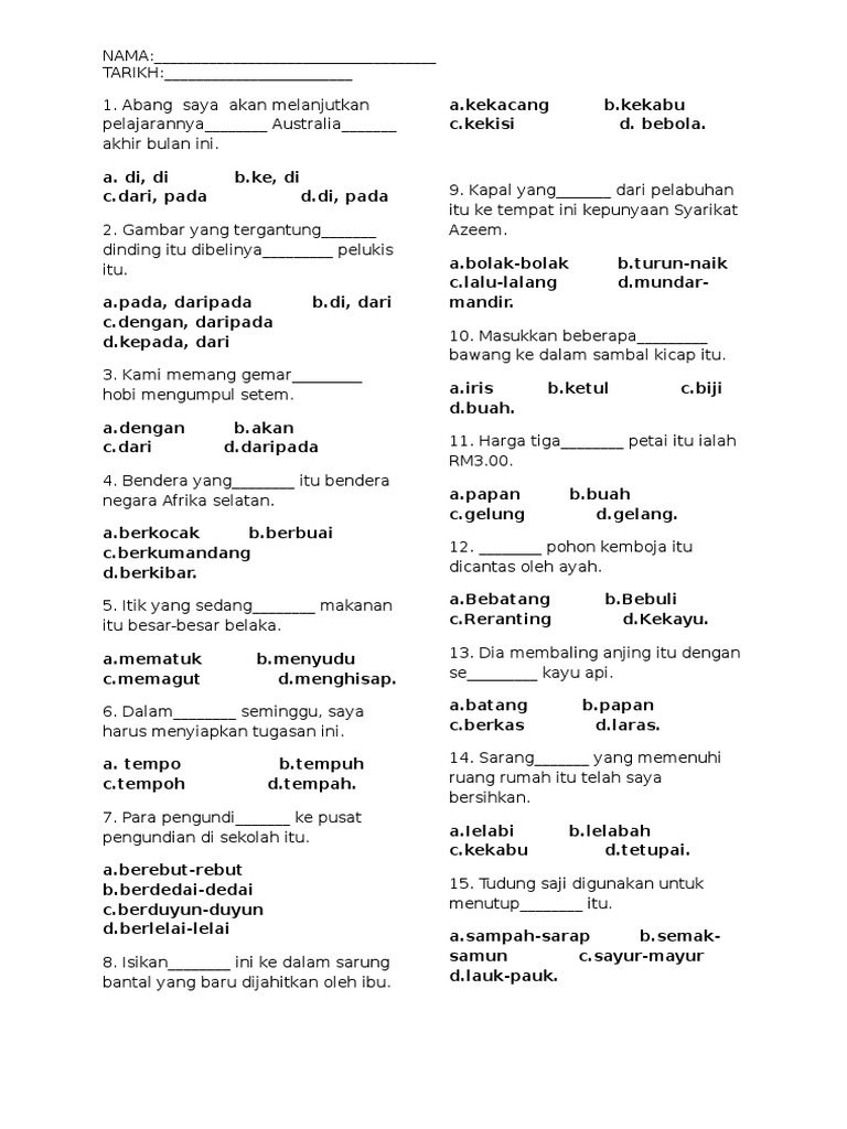 Soalan 22 hingga soalan 23pilih ayat yang sama maksud dengan ayat yang diberi.22. Sepanjang tahun ini, persatuan pencinta alam bercadang untuk mengadakan pelbagai. If you continue browsing the site, you agree to the use of cookies on this website. Disini terdapat dua belas (12) subjek yang dikongsikan oleh pihak kami. Soalan ujian bm tahun 4.
