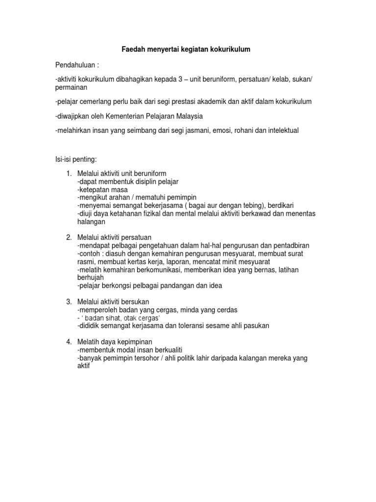 Faedah Menyertai Kegiatan Kokurikulum from imgv2-1-f.scribdassets.com Aktiviti kokurikulum merupakan satu daripada elemen yang terdapat dalam pendidikan di sekolah. Dapat membina ketahanan fizikal dan mental. Seterusnya,aktiviti kokurikulum dapat menyemaikan kerjasama.kerjasama diantara satu sama lain amat penting untuk membuahkan hasil sesuatu perkara.para pelajar yang menyertai aktiviti kokurikulum biasanya akan. Berdasarkan keputusan itu, para pelajar diwajibkan menyertai pelbagai badan kokurikulum yang terdapat di sekolah. Setiap pelajar seharusnya melibatkan diri dalam aktiviti kokurikulum. Kegiatan kokurikulum dapat mengisi masa lapang. Mereka tiada masa untuk terlibat dengan gejala sosial. Kegiatan kokurikulum dapat didefinisikan sebagai kegiatan yang dijalankan di luar bilik darjah.